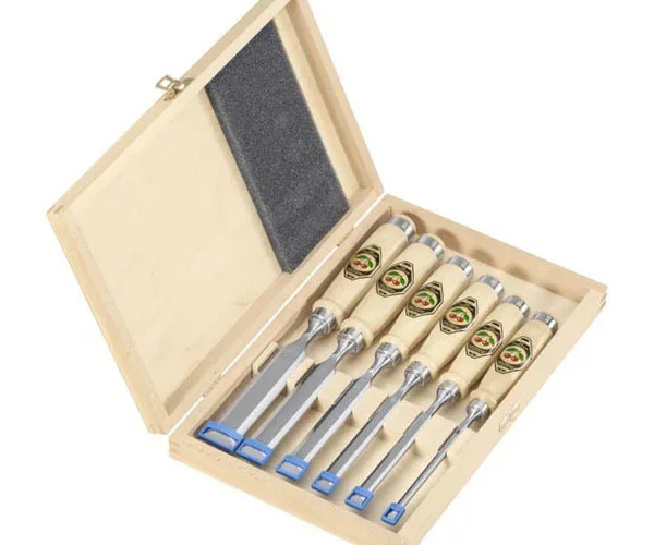 Lieferumfang:Stechbeitelsatz 6,10,12,16,20,26 mmInhalt: je 1 St. Stechbeitel Schneidenbreite 6,10,12,16,20,26 mm Lieferung im HolzkastenProduktbeschreibung:DIN 5139 · hoch kohlenstoffhaltiger Werkzeug-Spezialstahl · mit Seitenfasen und abgeflachtem, lackiertem Weißbuchenheft Ulmer Form · mit 2 Stahlzwingen Technische D